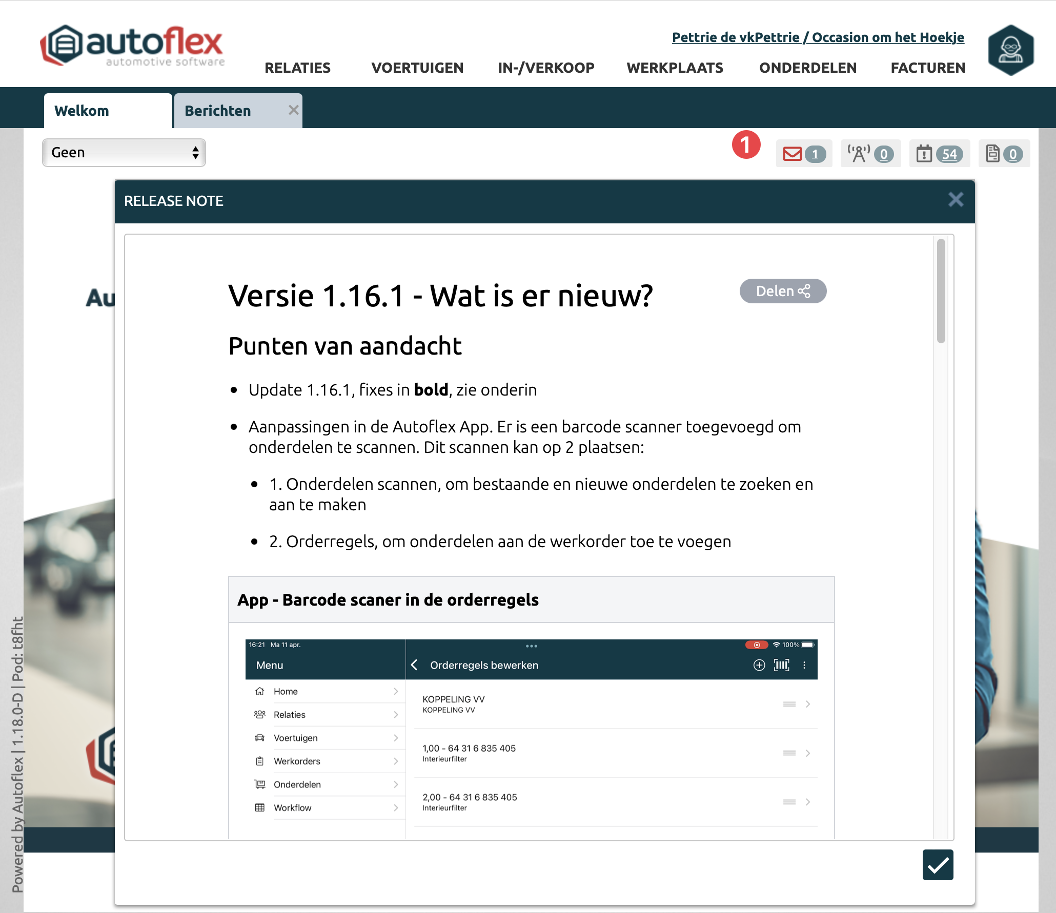 Voor het overzicht van de release notes ga je naar berichten, dit open je door op het envelop icoon te klikken.