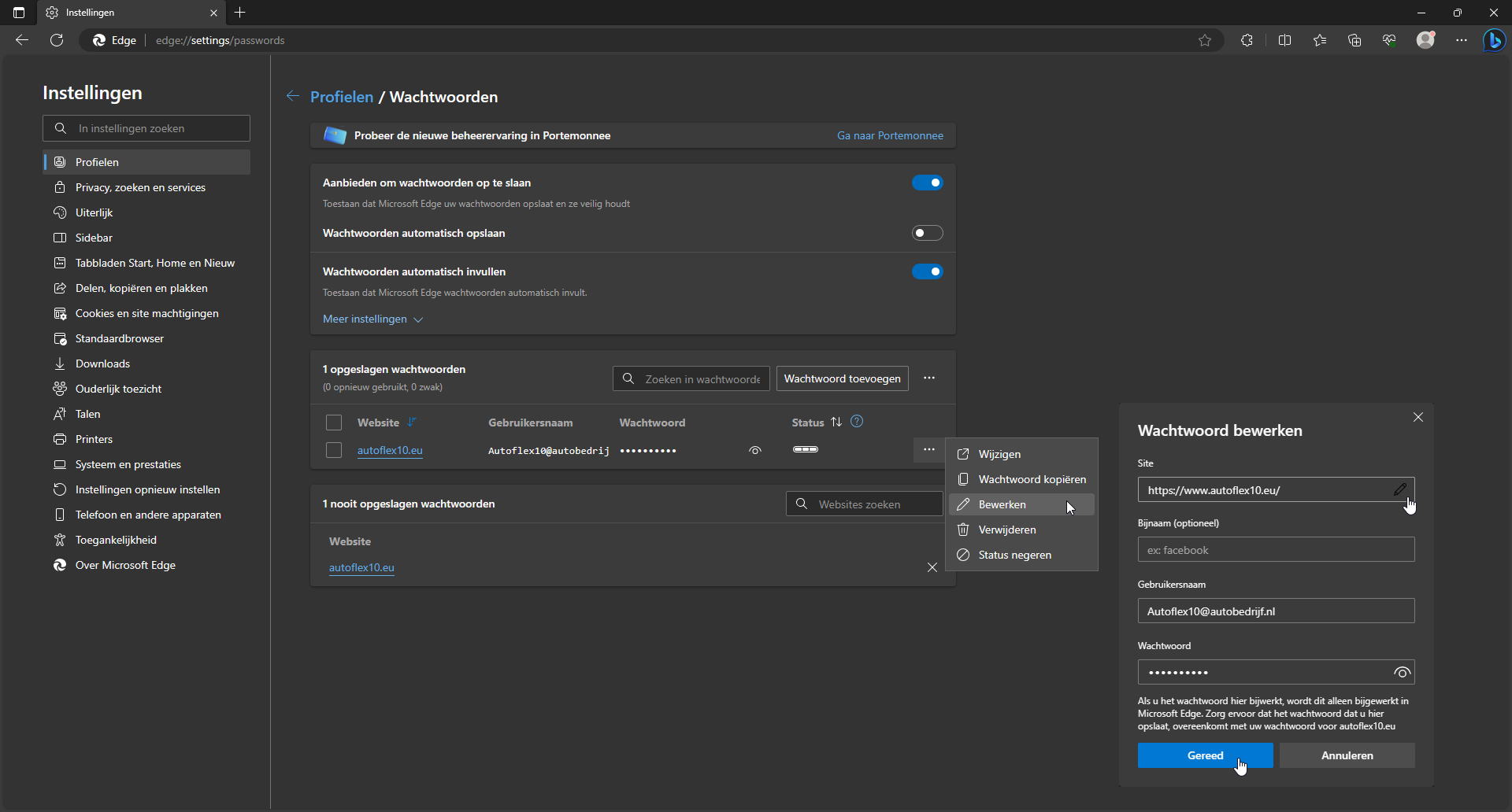 Verander https://Autoflex10.nl in https://Autoflex10.eu en klik dan op GereedDe opgeslagen inloggegevens worden nu gebruikt voor https://www.autoflex.eu