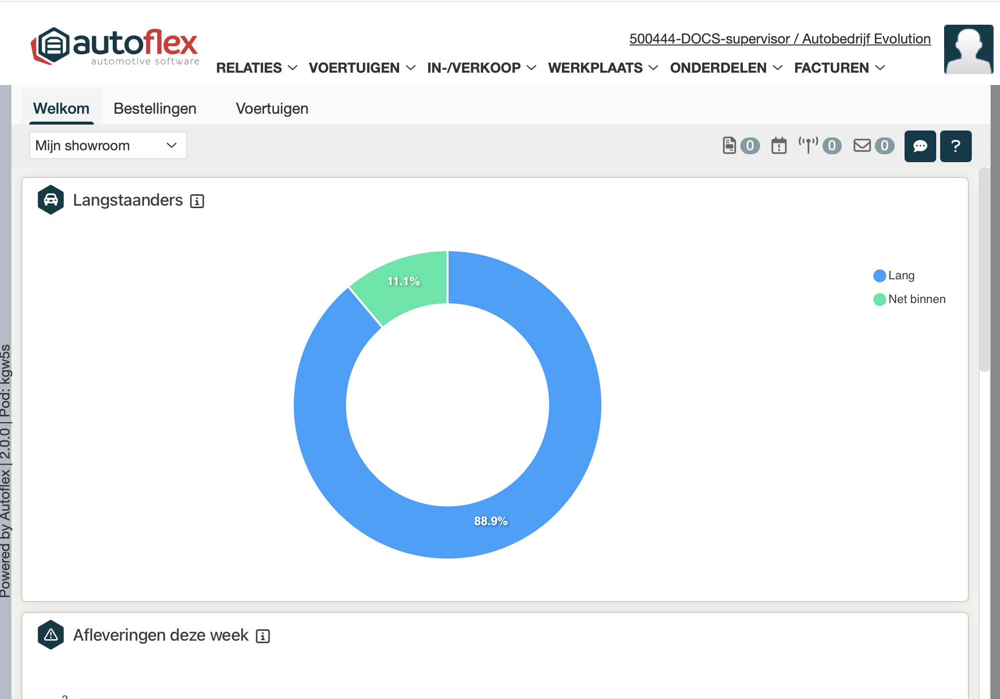 Een compleet overzicht van alle lopende zaken in de showroom. Klik je op een vlak in de taartdiagram dan opent een overzicht met de betreffende auto's. |