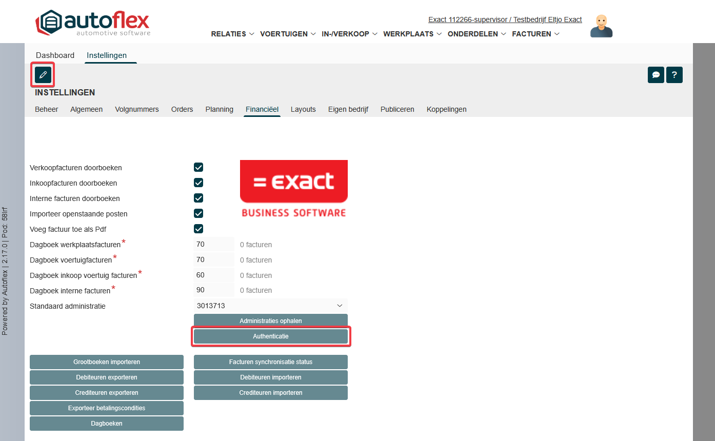 Tijdens de installatie van Autoflex is de koppeling met Exact Online gemaakt. Voor het maken van de koppeling met Exact Online moet er geauthentiseerd worden. Als dit opnieuw gedaan moet worden moeten onderstaande stappen worden uitgevoerd.