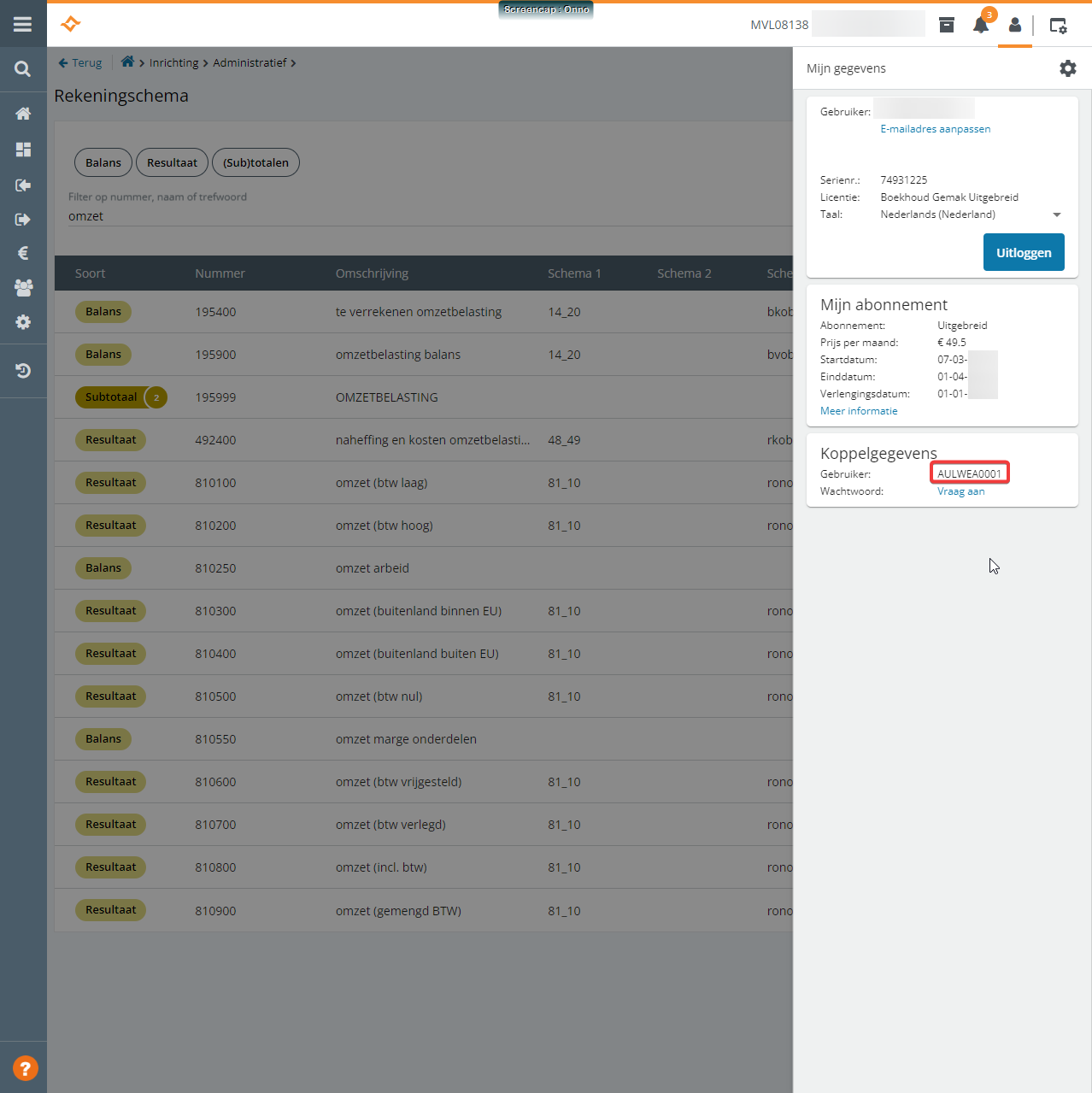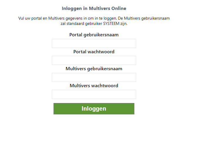 Vul het veld “Gebruiker“ bij de “Koppelgegevens“ in als “Portal gebruikersnaam“ in Autoflex. Het wachtwoord is hetzelfde wachtwoord als waarmee je in boekhoudgemak bent ingelogd. Bij “Multivers gebruikersnaam“ zet je “SYSTEEM“ en bij “Multivers wachtwoord“ niets (leeg laten dus). |