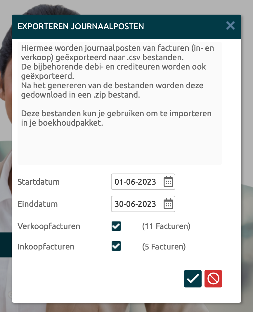 Zip bestand met daarin de journaalposten als CSV bestanden In dit voorbeeld is in de export verkoop- en inkoopfacturen aangegeven De gekoppelde debiteuren en crediteuren worden ook altijd geexporteerd |