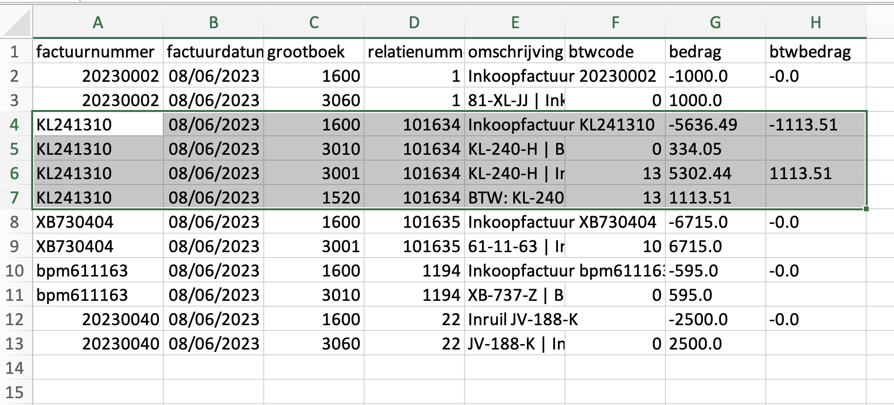 factuurnummer factuurdatum grootboek relatienummer omschrijving btwcode bedrag btwbedrag