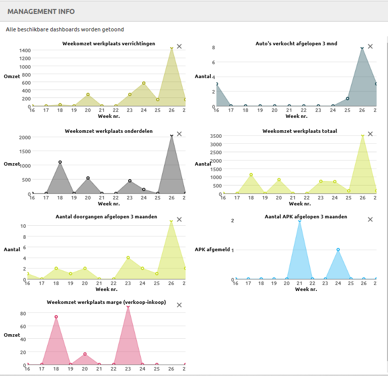 Weekomzet werkplaats verrichtingen | Geeft omzet van de week om alle verrichtingen. |