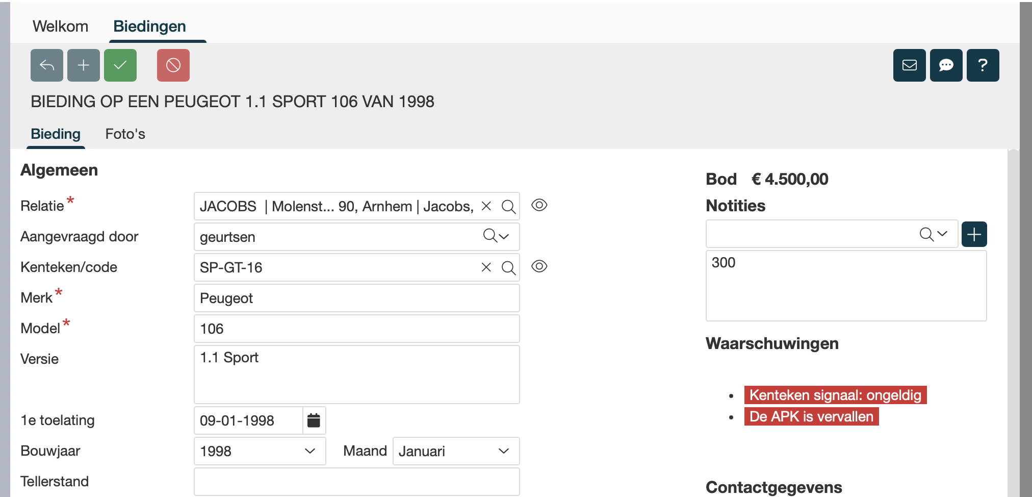 Bij elke bieding kun je aangeven wanneer deze is gedaan en welk personeelslid deze heeft ingevoerd. Wanneer je bieding wordt geaccepteerd, kun je de datum van goedkeuring en de contactpersoon die het bod heeft geaccepteerd registreren. Tevens heb je de mogelijkheid om meteen de afhaaldatum van het voertuig vast te leggen.