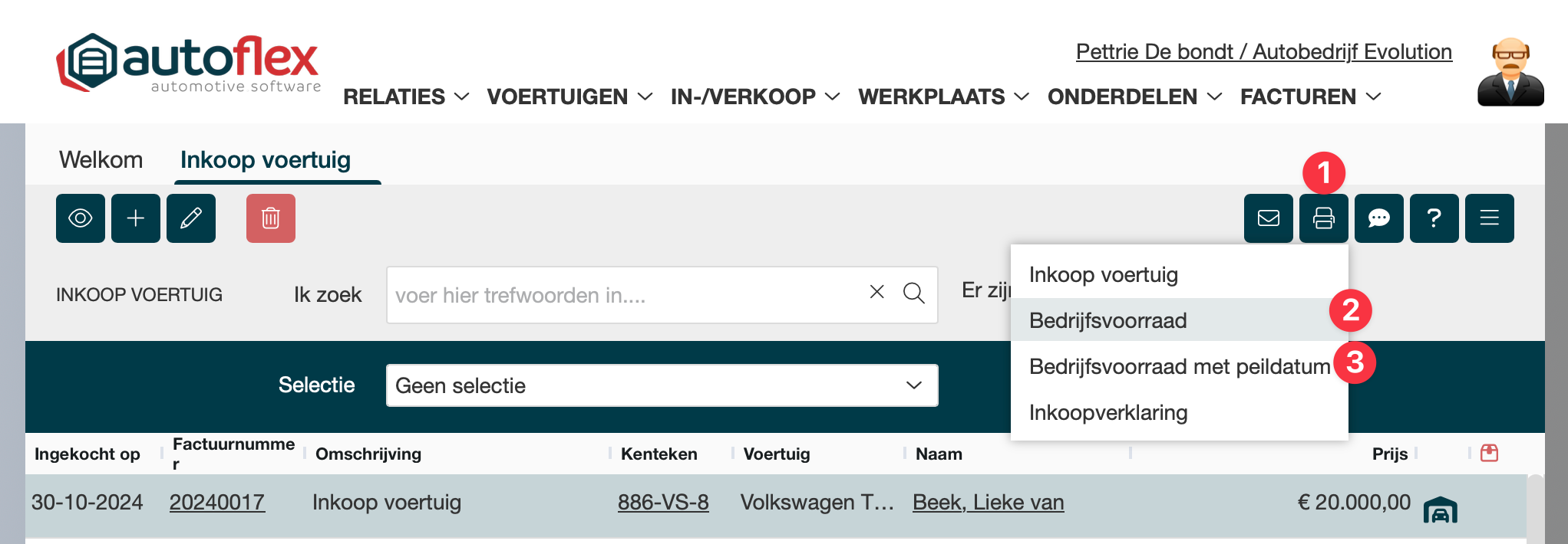 Het rapport bedrijfsvoorraad draait de voorraad uit van dit moment als pdf. Het systeem kijkt of het vinkje bedrijfsvoorraad aan staat. Het andere pdf rapport, bedrijfsvoorraad met peildatum, kijkt of de voertuigen zijn ingekocht en/of verkocht voor de ingevoerde peildatum. Een voertuig welke is verkocht op 1-2 staat dus wel op de bedrijfsvoorraad met peildatum 30-1 omdat hij op dit dag nog niet verkocht was. Zo kun je terug kijken naar de voorraad op een bepaald moment.
