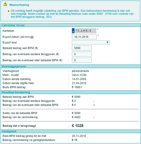 In de melding bij deze berekening zie je dat er geen betrouwbare berekening mogelijk is. Voor het juiste BPM bedrag neem je daarom contact op met de belastingdienst. |