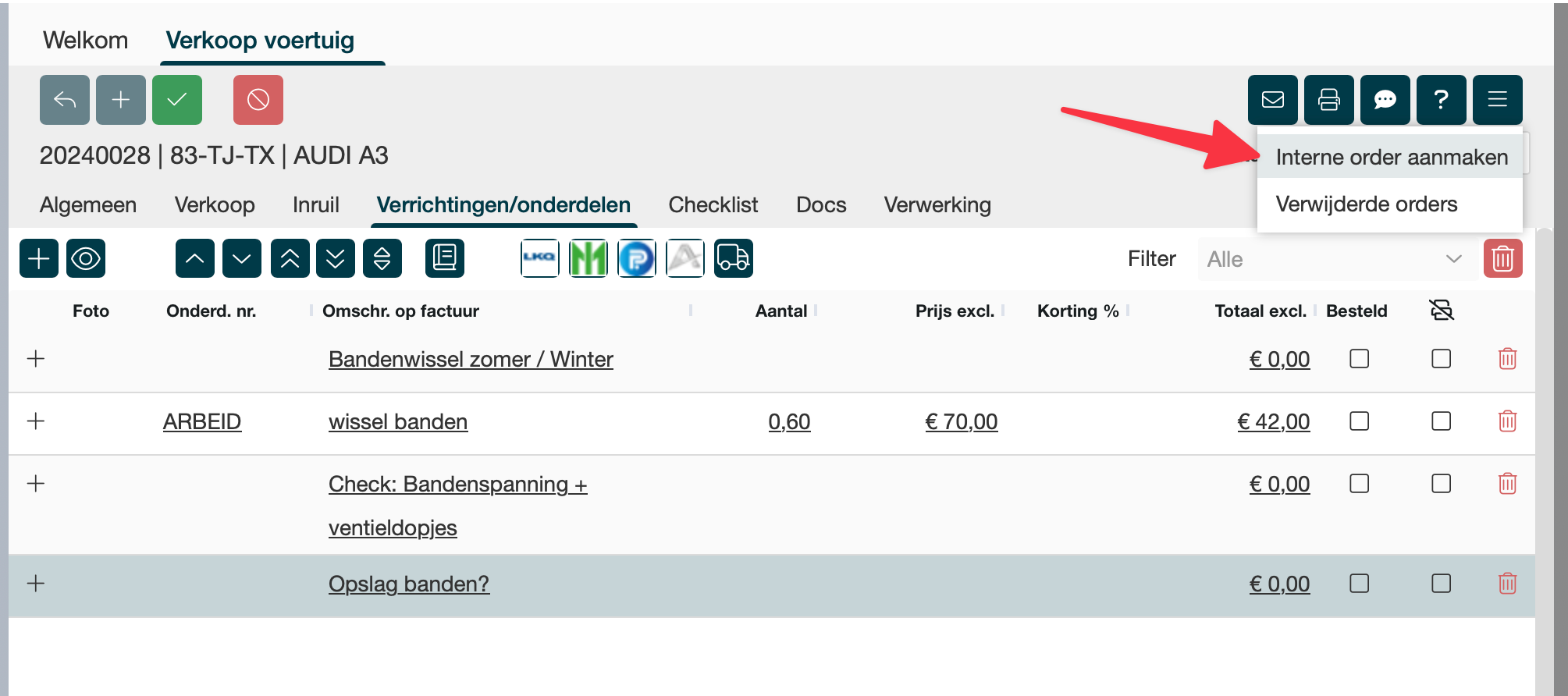 Klik daarna rechtsboven op de hamburgermenu en klik op Interne order aanmaken.