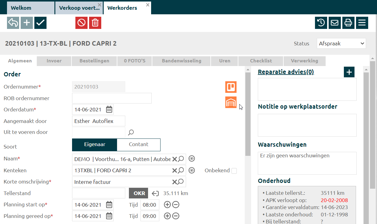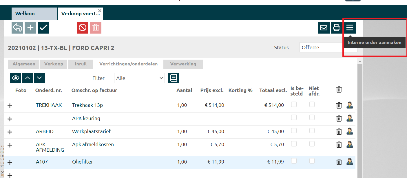Vul de tabbladen Algemeen en Verkoop in en daarna kan je onder tabblad Verrichtingen/onderdelen de onderdelen en/of werkzaamheden, zoals een APK of trekhaak.