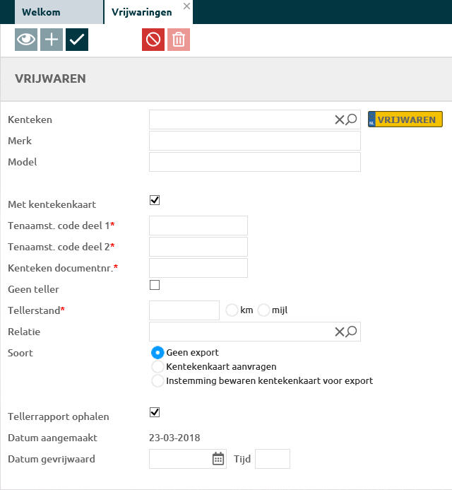 Met de module Vrijwaringen, kan je na het inkopen van het voertuig de oude eigenaar vrijwaren. Vrijwaren is het aanpassen van de Online Registratie Bedrijfsvoorraad (ORB) bij de RDW.