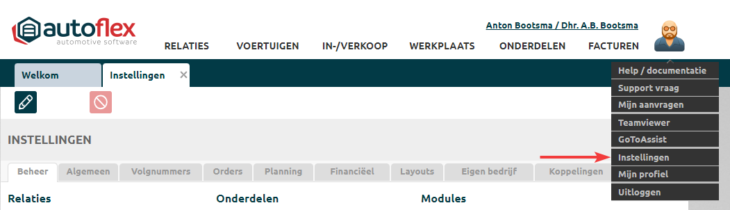Dit scherm vind je door op je persoonlijke icoon of foto te klikken rechts bovenin. In het instellingen-scherm kunnen de diverse instellingen binnen het Autoflex10 pakket worden onderhouden en aangepast. |
