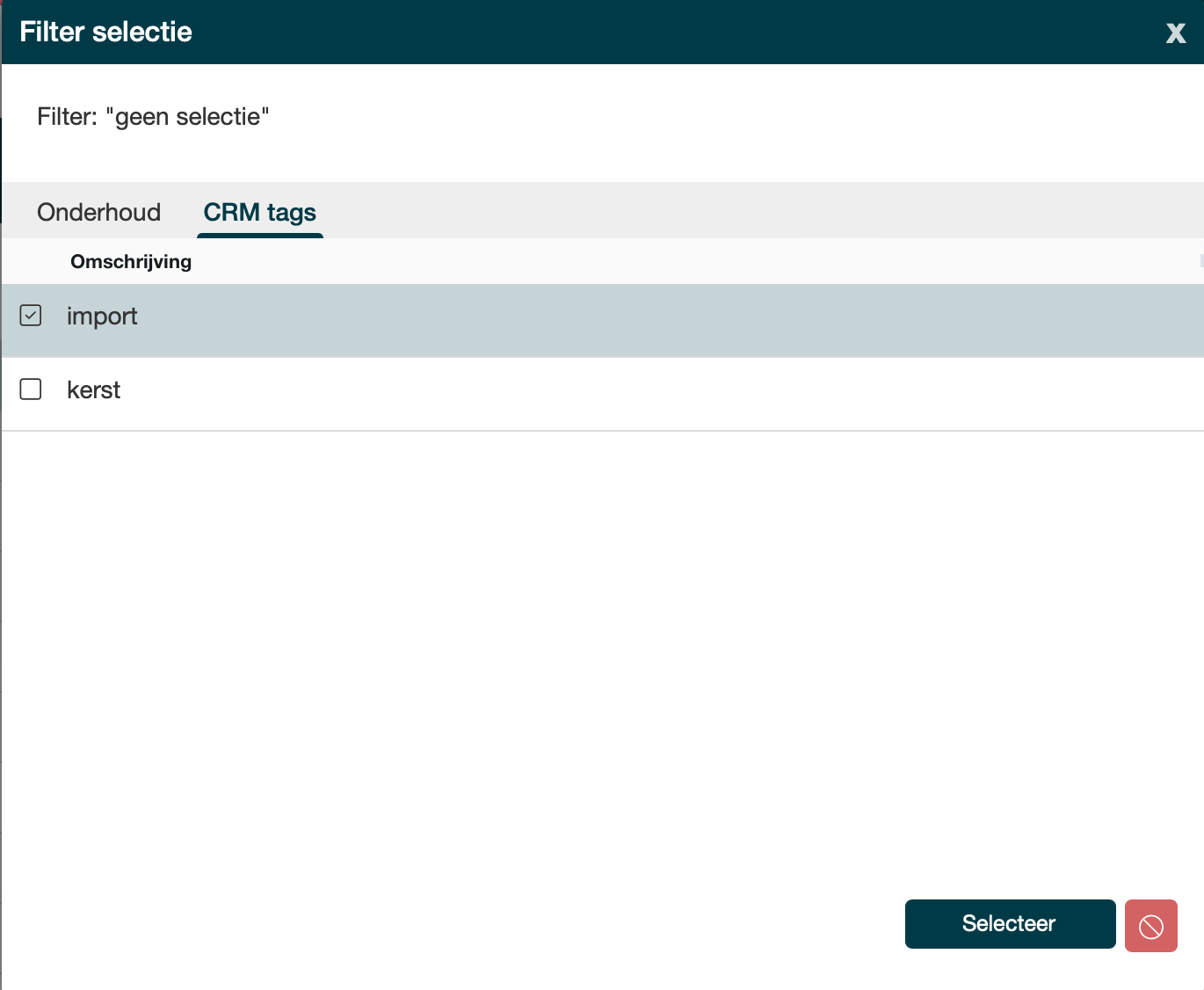 Door te klikken op het CRM tag veld of op het vergroot glas opent een dialoog om CRM tags toe te voegen, te selecteren of te de-selecteren.