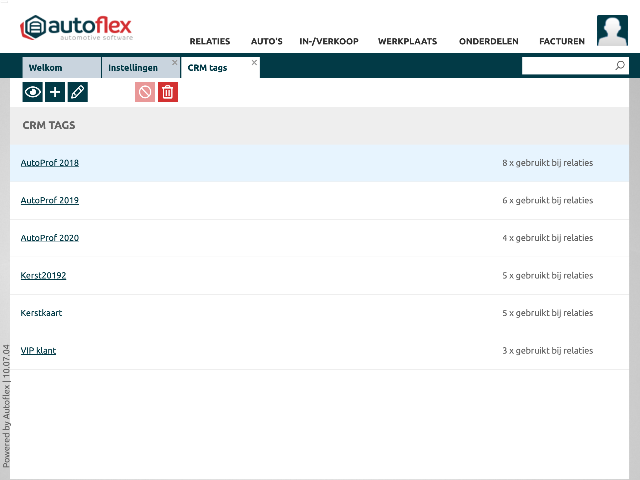 Via Instellingen → Beheer → Relaties → CRM Tags zie je het CRM tags overzicht. De CRM tags zijn zichtbaar wanneer je over de module CRM beschikt.