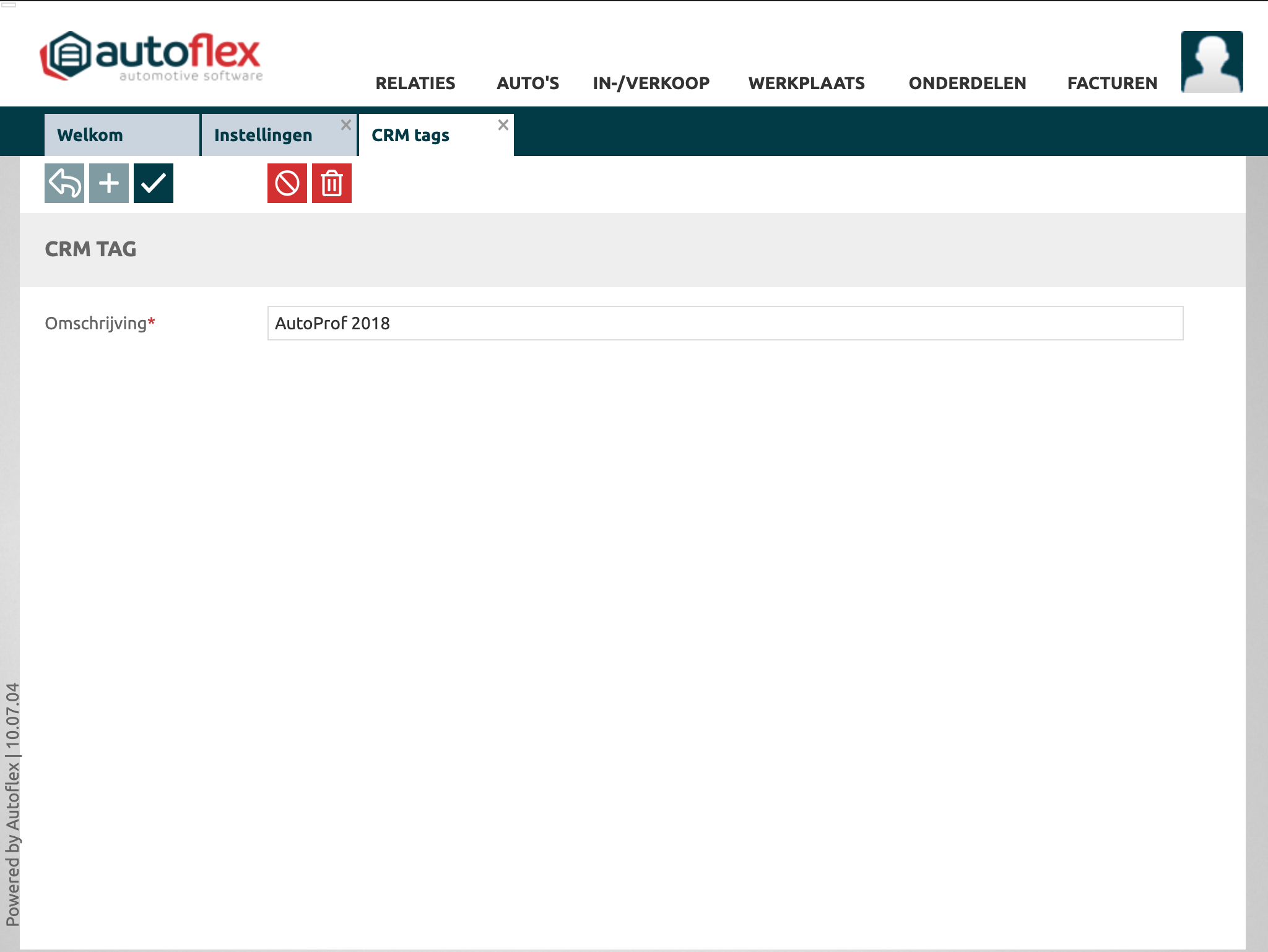 In het scherm is een nieuw tag toe te voegen door een omschrijving in te vullen en op de '+' knop te klikken, De nieuwe tag wordt meteen geselecteerd en toegevoegd aan de lijst van CRM tags zodat deze ook bij andere relaties is te selecteren. Bestaande CRM tags kunnen hier geselecteerd en gede-selecteerd worden voor deze relatie. |