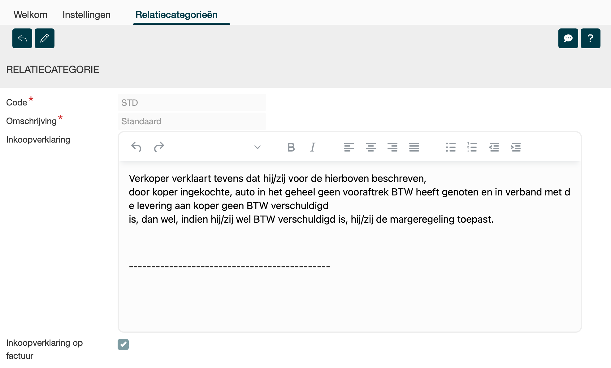 Op dit moment is er maar 1 relatiecategorie beschikbaar. Hier kun je de tekst voor de inkoopverklaring aanpassen. |
