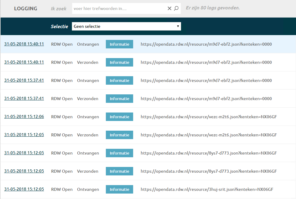 De communicatie vanuit Autoflex10 met de RDW open data worden gelogd en met een filter of een zoekwoord kan in deze lijst worden gezocht. Door op de link te klikken kunnen de details van de logging worden bekeken.