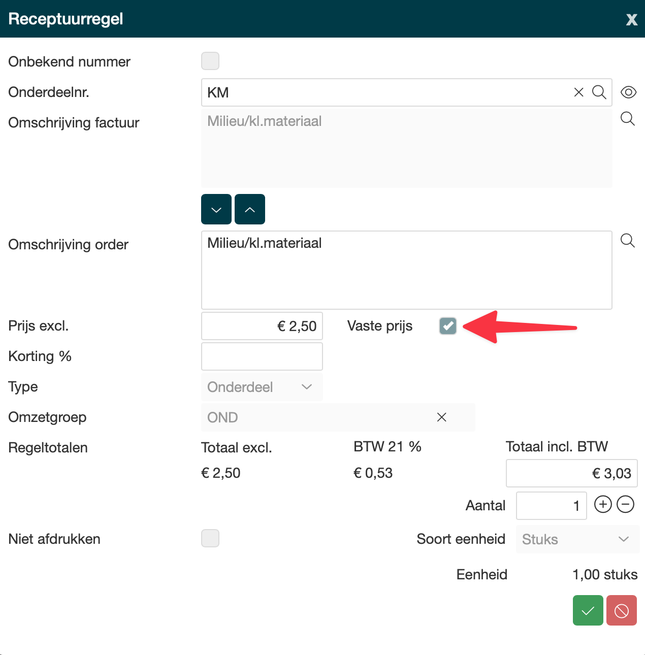 Vaste prijs = Maakt prijs aanpasbaar en zet deze vast voor dit receptuur