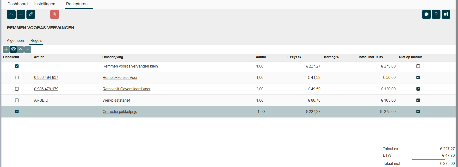 Receptuur order regels, deze kun je net als een order toevoegen, aanpassen en weer verwijderen. |