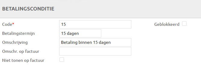 Als je geen tekst betreft de betalingsconditie op je factuur wilt, dan zet je het vinkje aan bij: Niet tonen op factuur.  |