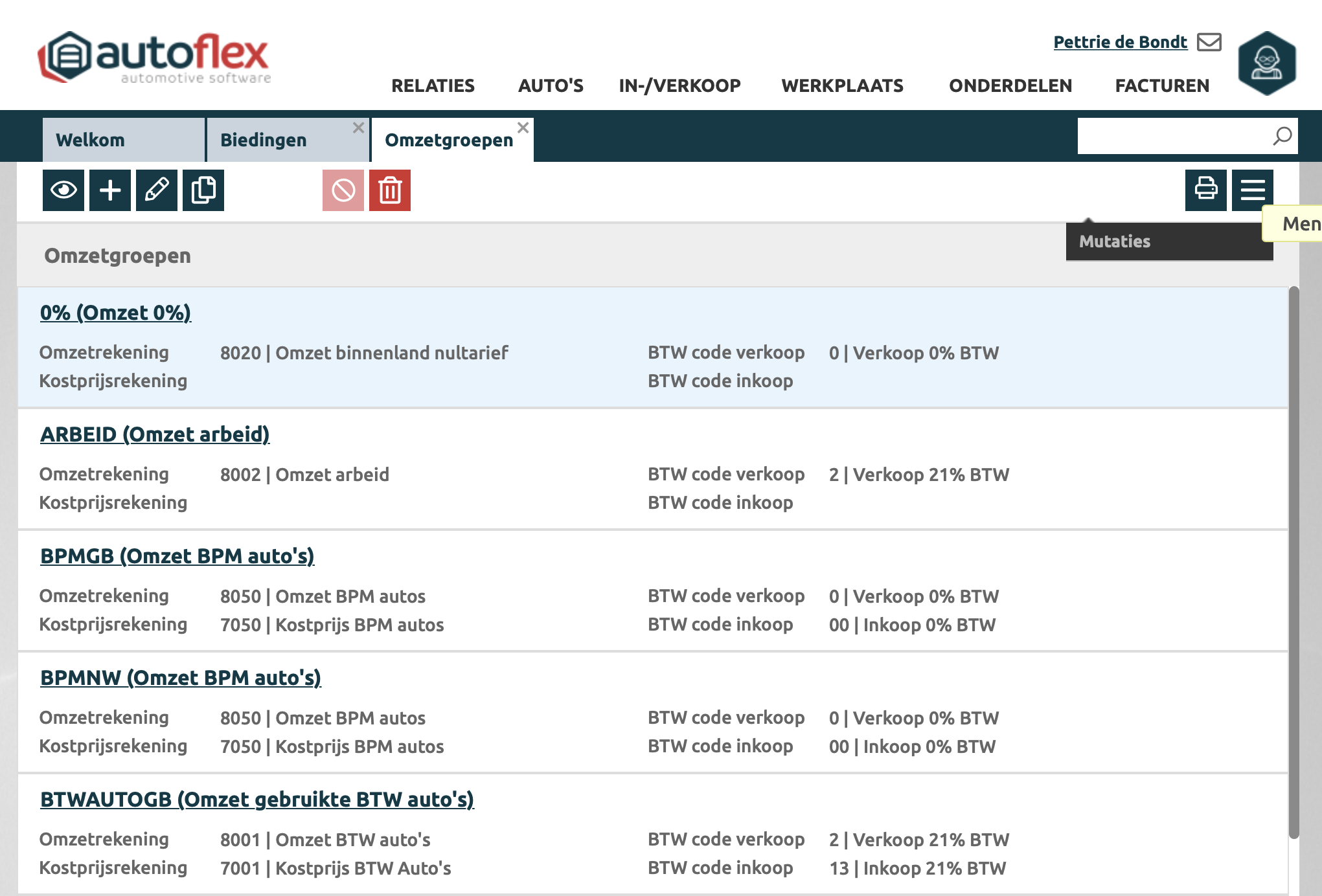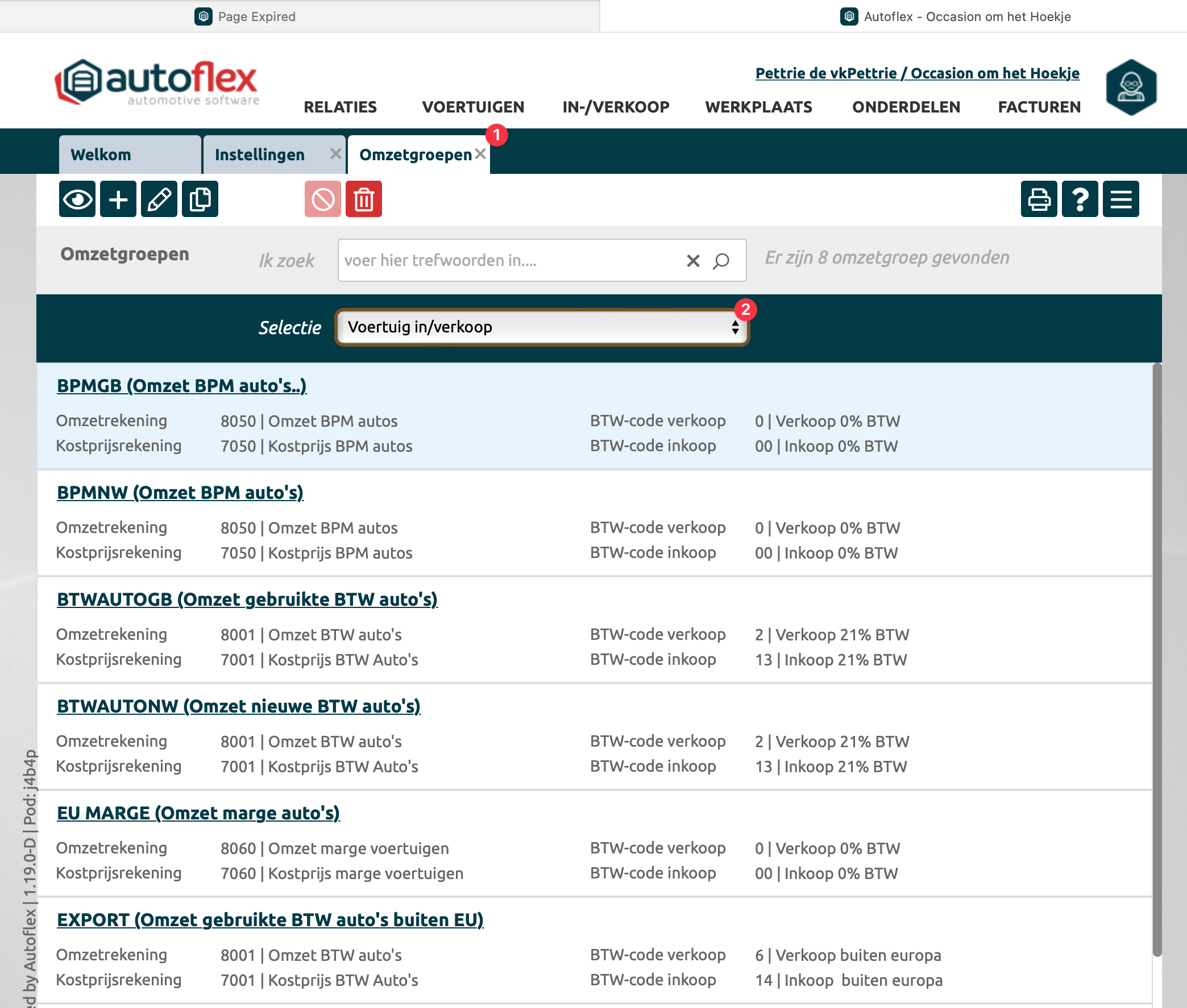 De omzetgroepen voor de verwerking van de financiën binnen Autoflex
