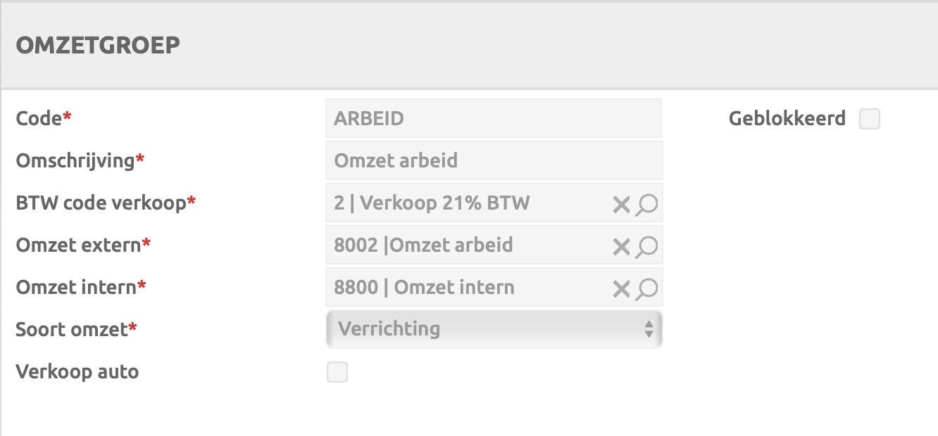 Bij een omzetgroep voor de verkoop voertuig zijn de volgende velden aanwezig