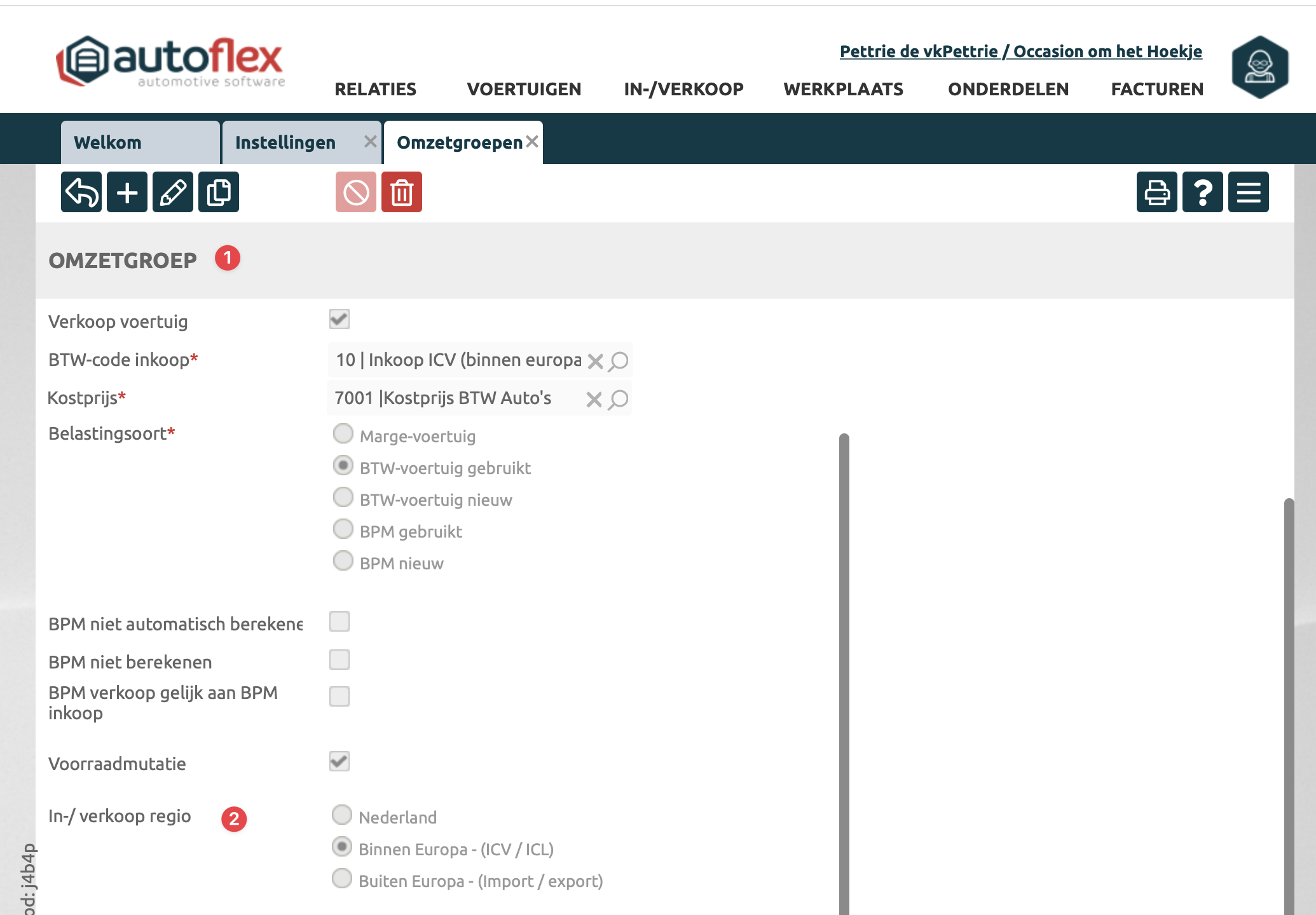 Deze keuze zorgt ervoor dat, in het geval van een import voertuig, bij de inkoop de juiste omzetgroep voorgeselecteerd wordt. Ook bij verkoop voertuig is dit het geval.Tekst op verkoop factuur = tekst die op de verkoop factuur getoond wordt