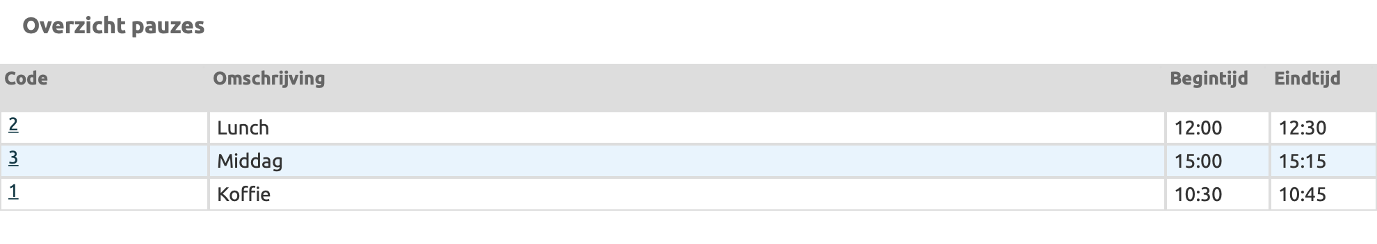 Code = korte code die deze pauze beschrijft, maximaal 15 tekens lang