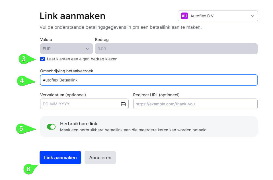 Als je de betaallink hebt aangemaakt en gekopieerd stel je het in Autoflex in op twee plaatsen in de instellingen: