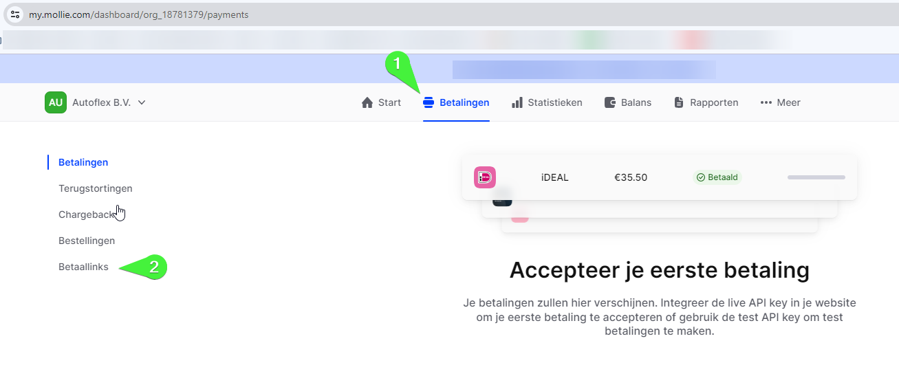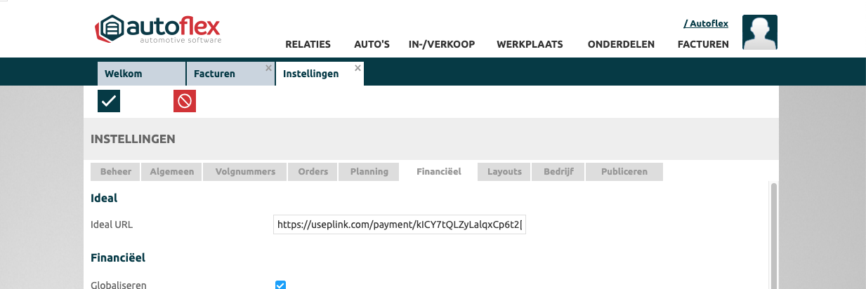 Als je de betaallink hebt aangemaakt en gekopieerd stel je het in Autoflex in op twee plaatsen in de instellingen:
