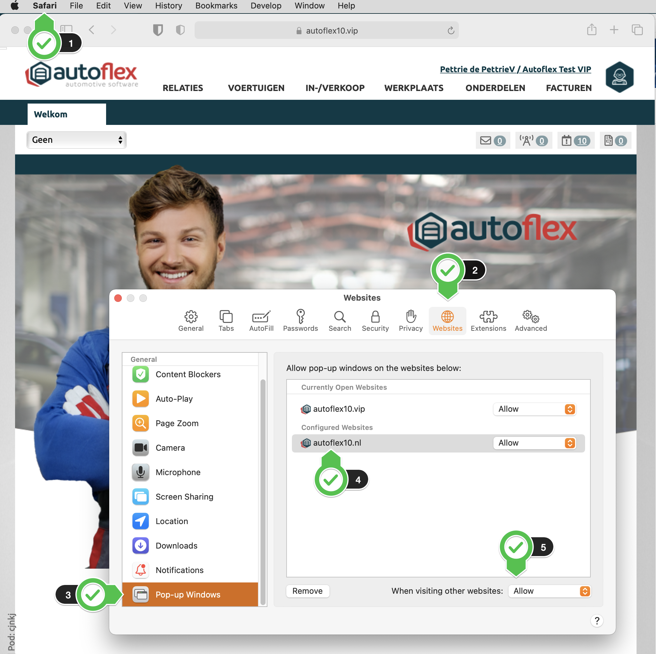 On de lijst van websites, kies de Autoflex10.nl website en laat popups toe