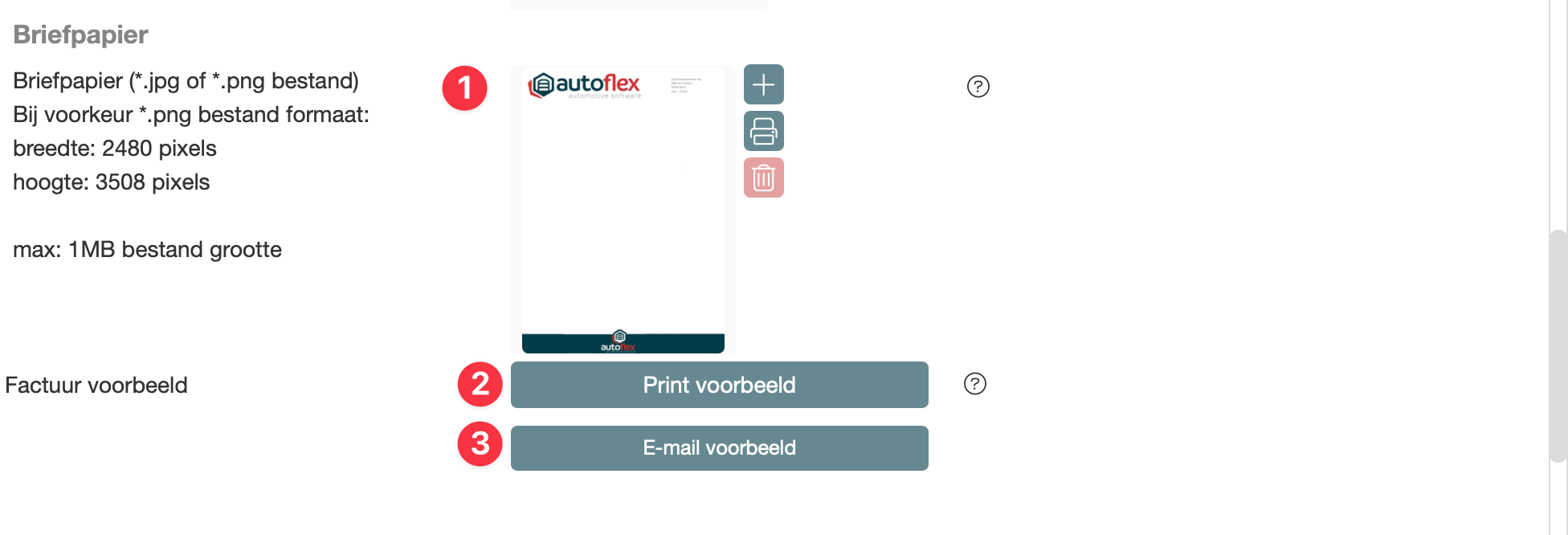 | checkbox Dit is handig wanneer de voettekst niet standaard op het briefpapier staat. dan wordt deze door autoflex toegevoegd bij het versturen van een e-mail De IBAN, BTW en KVK nummers worden dan ook op het factuur getoond | |