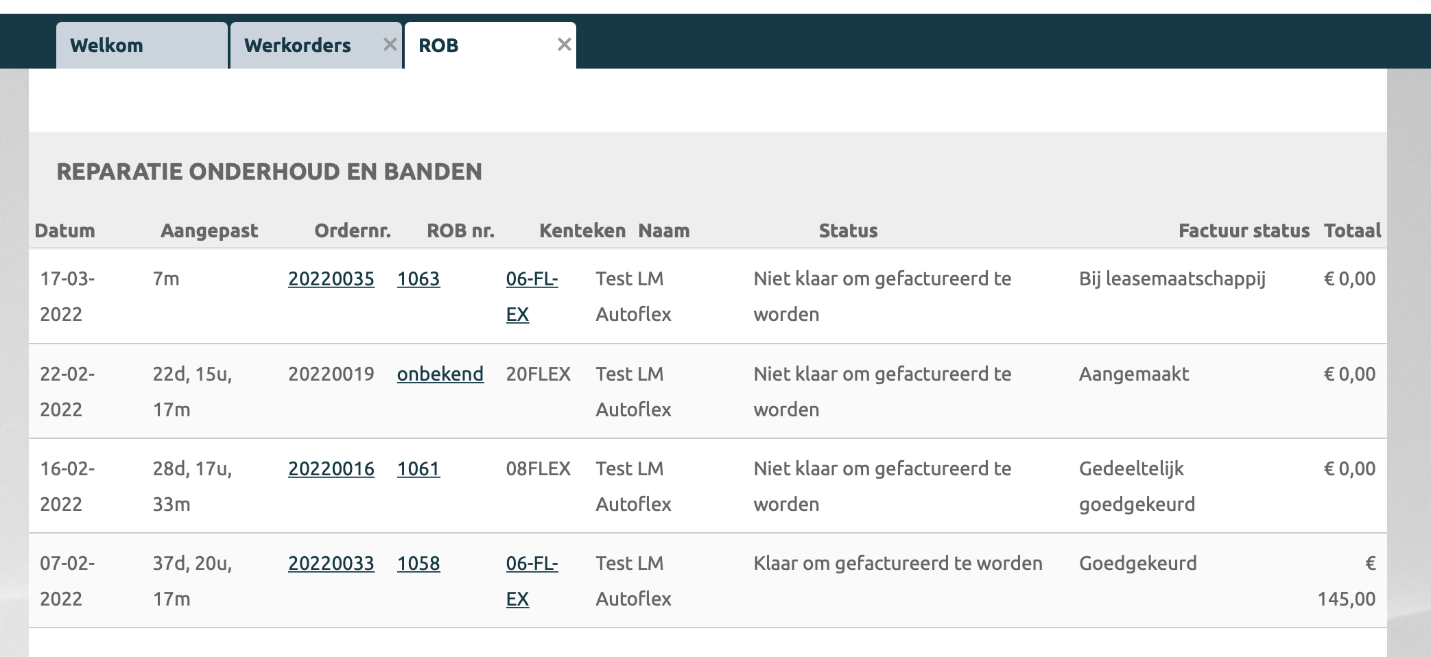 Het systeem voor de administratieve communicatie tussen leasemaatschappij en leverancier op het gebied van Reparatie, Onderhoud, Banden en Vervangend Vervoer. Voor meer informatie over ROB ga naar: ROB NET. Koppel je ROB account aan Autoflex, om efficiënter te werken.