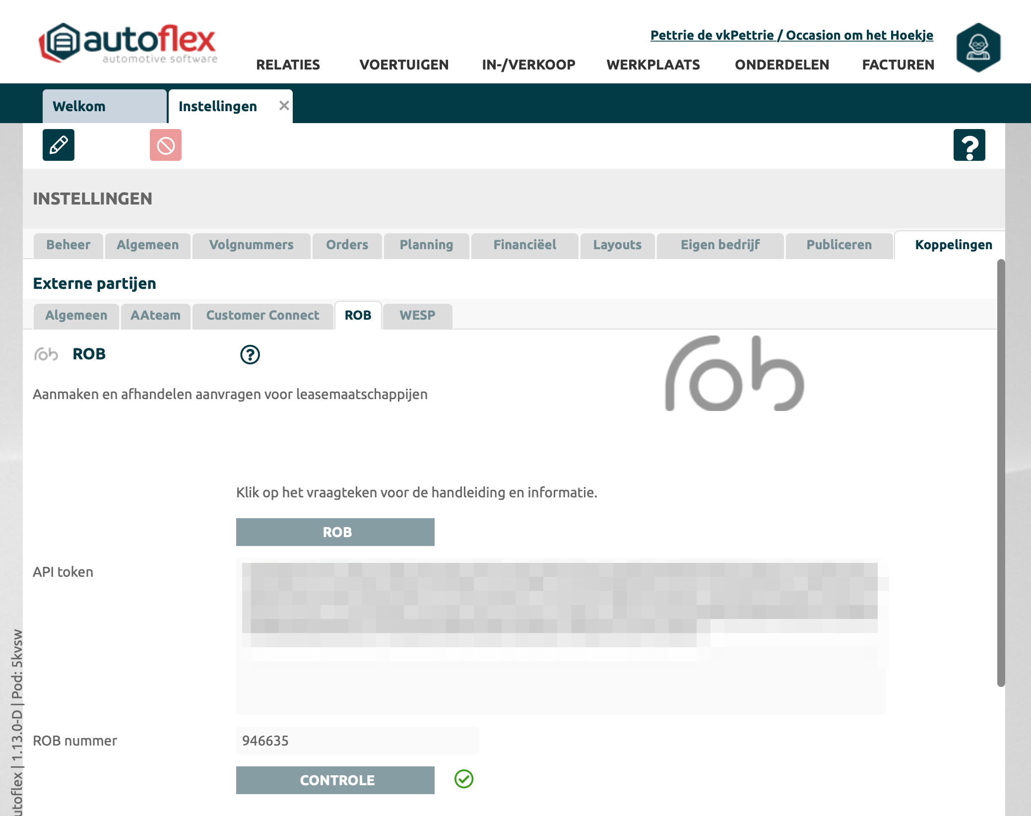Dit token wordt in Autoflex bij het menu instellingen → koppelingen → Rob ingevoerd. Ook wordt hier het deelnemersnummer van het garagebedrijf ingevoerd. |