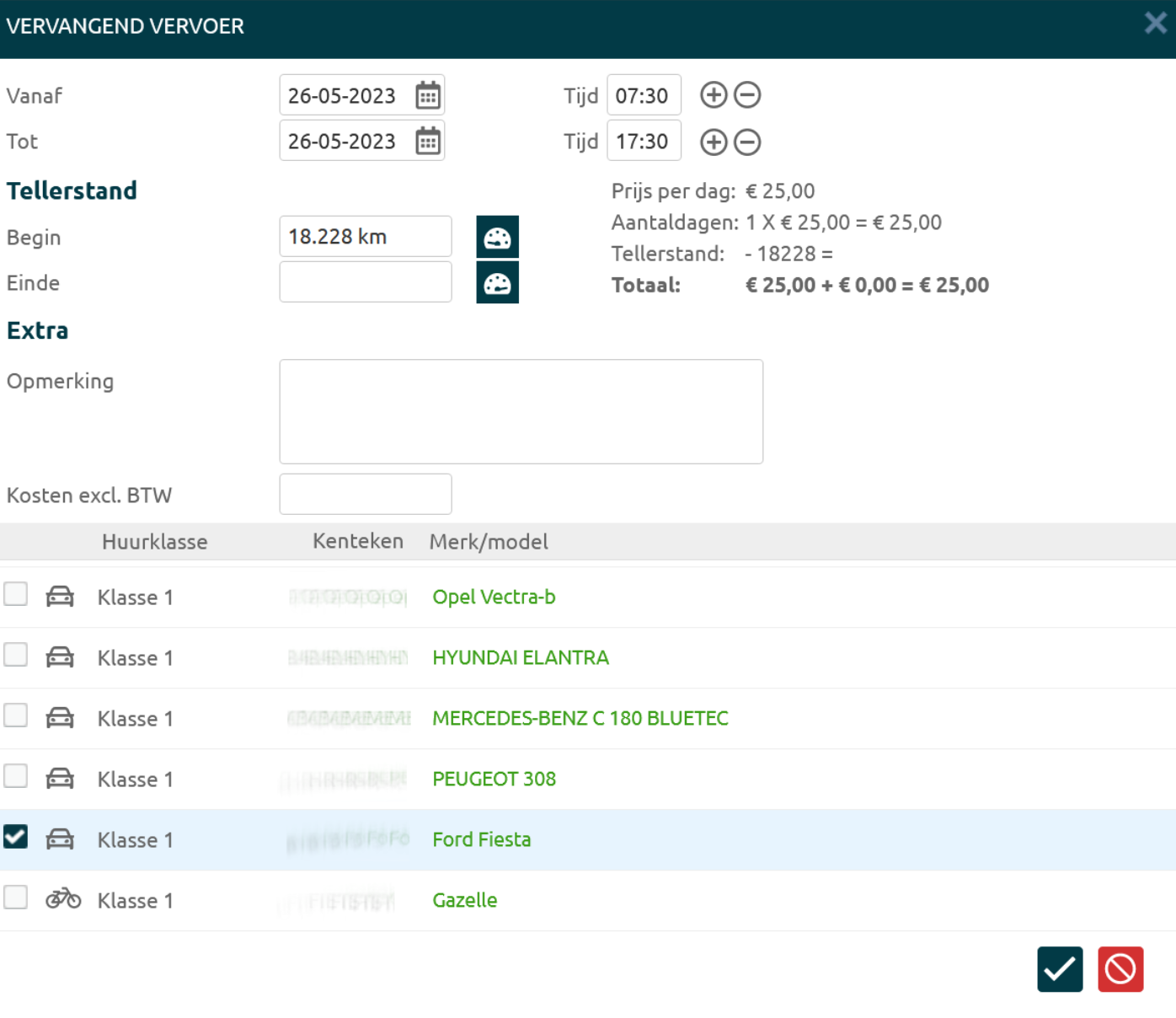 Vervangend vervoer details wijzigen. De tellerstanden zijn hier op te halen. |