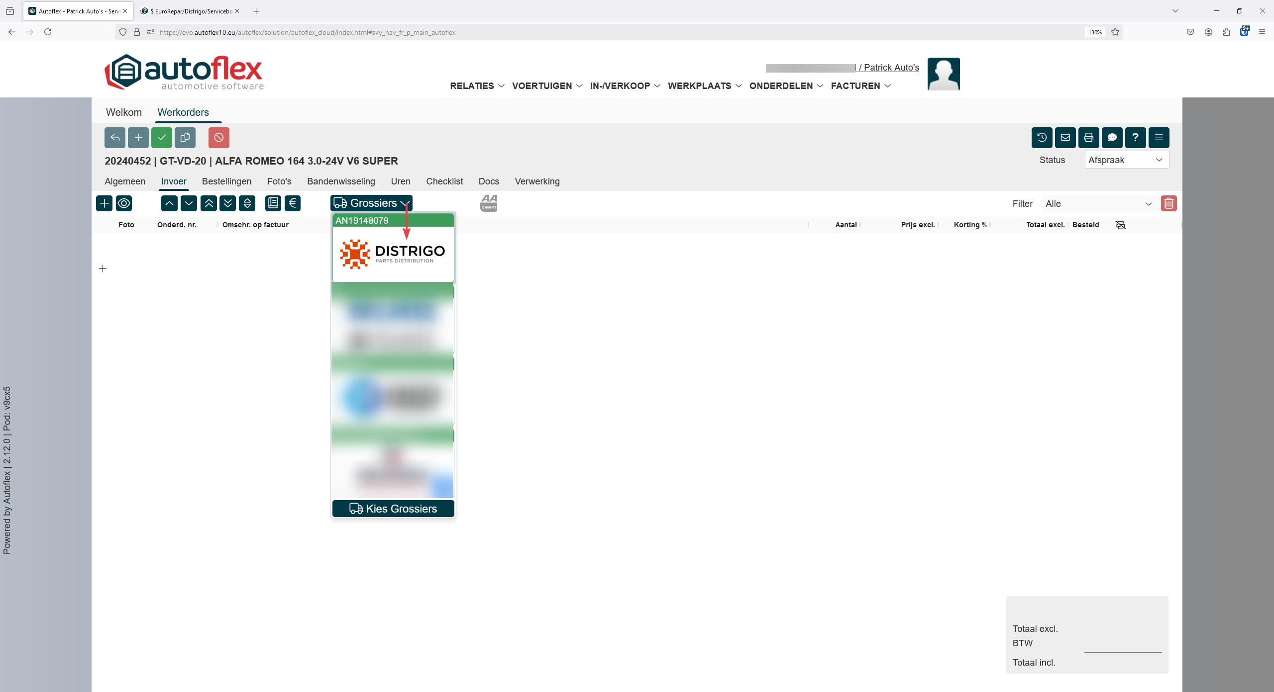 Na het aanmaken van een werkorder kun je bij onderdelen kiezen voor de grossiers koppeling van Distrigo.