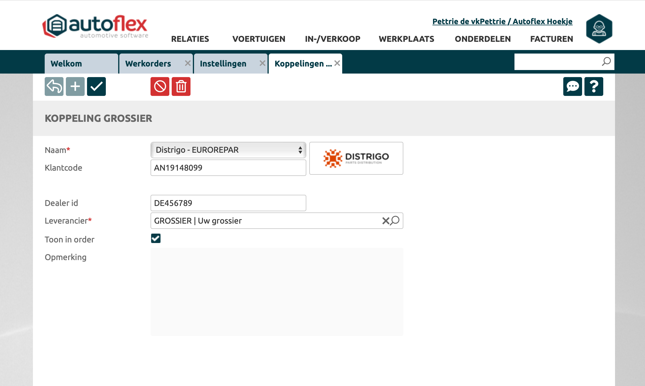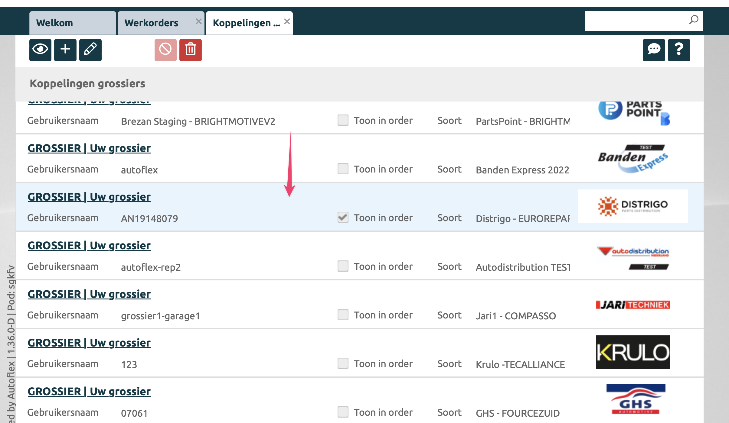 Open het overzicht via: Instellingen → Beheer - Onderdelen → Koppelingen Grossiers