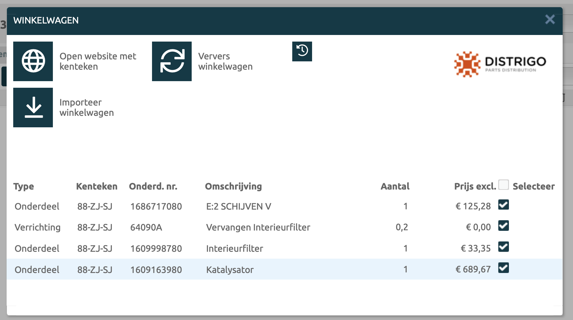 Met de knop: importeer winkelwagen kunnen de onderdelen op de order worden gezet |