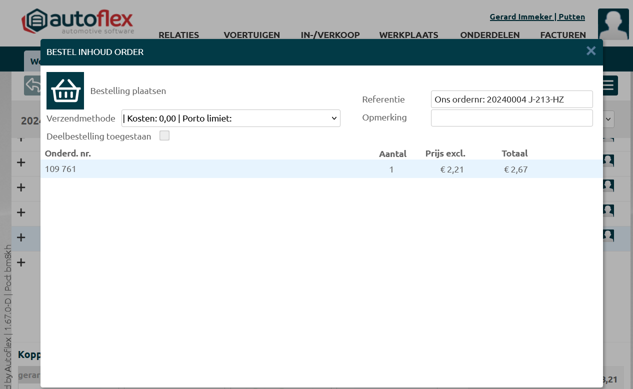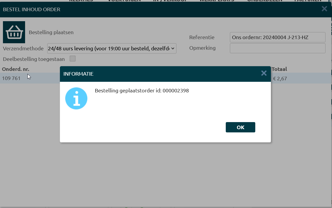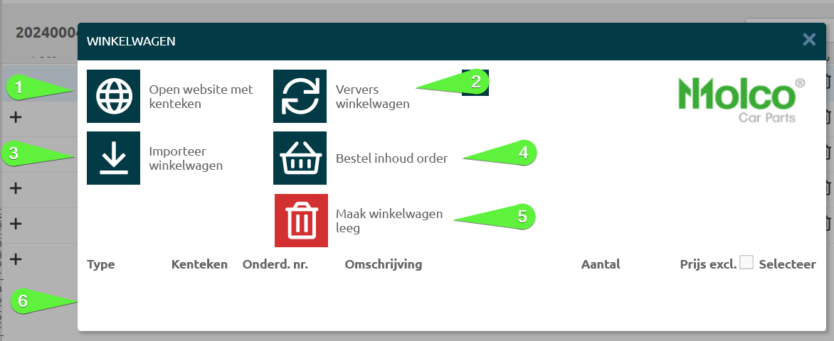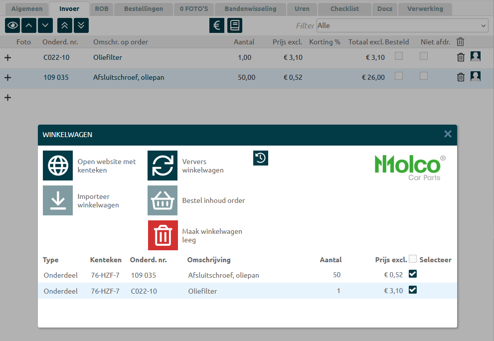 Wanneer je de onderdelen wilt bestellen, klik je opnieuw op de Molco koppeling, je selecteert de onderdelen en kiest voor “Bestel inhoud order”. |