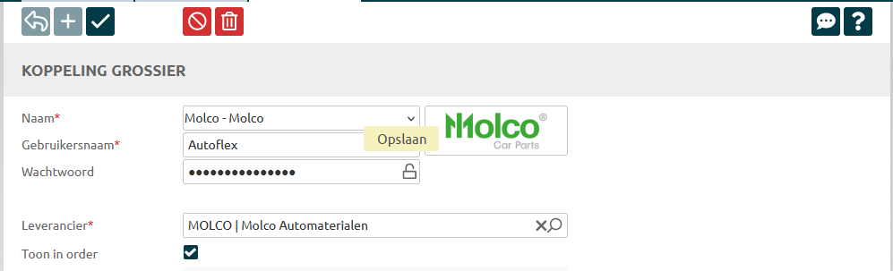 Via het plusje voeg je een nieuwe koppeling toe. Selecteer Molco. Voer je inloggegevens van de webshop in en zet het vinkje “Toon in order” aan. |