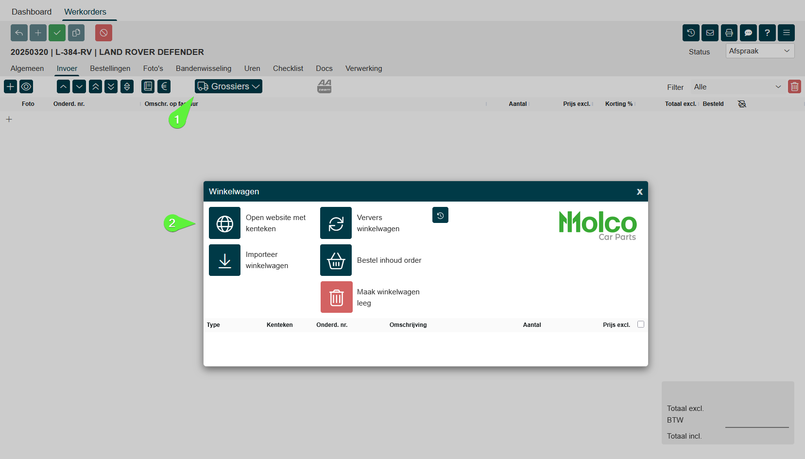 Selecteer de grossierskoppeling van Molco in de werkorder |