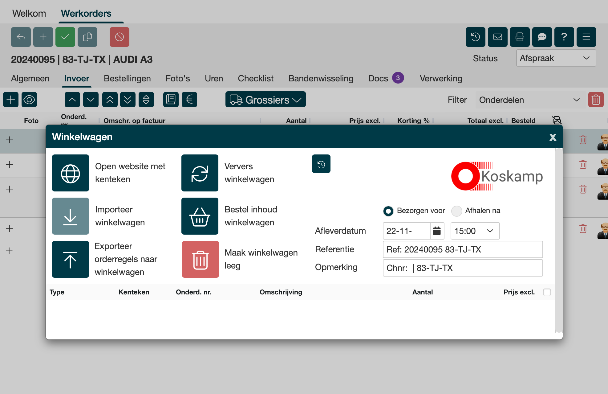 Grossierskoppeling Koskamp in de werkorder Na het klikken op het Koskamp logo zie je de mogelijkheden van de ze koppeling |