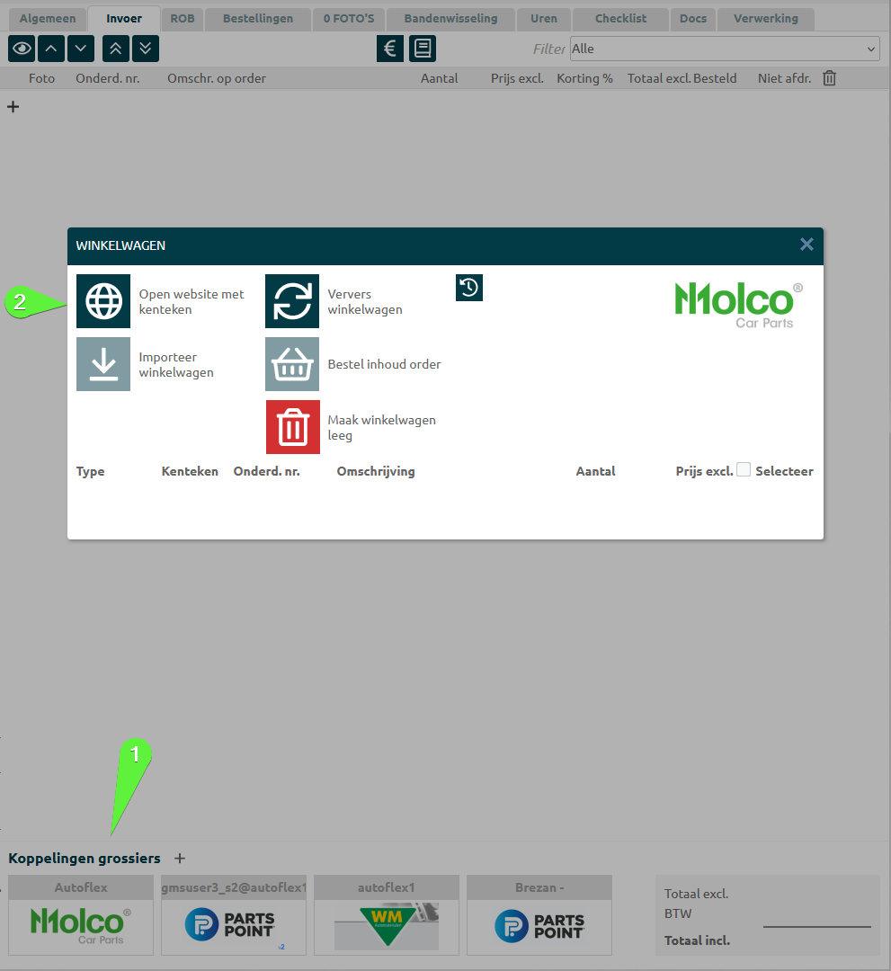 Wanneer je de onderdelen wilt bestellen, klik je opnieuw op de Molco koppeling, je selecteert de onderdelen en kiest voor “Bestel inhoud order”. |