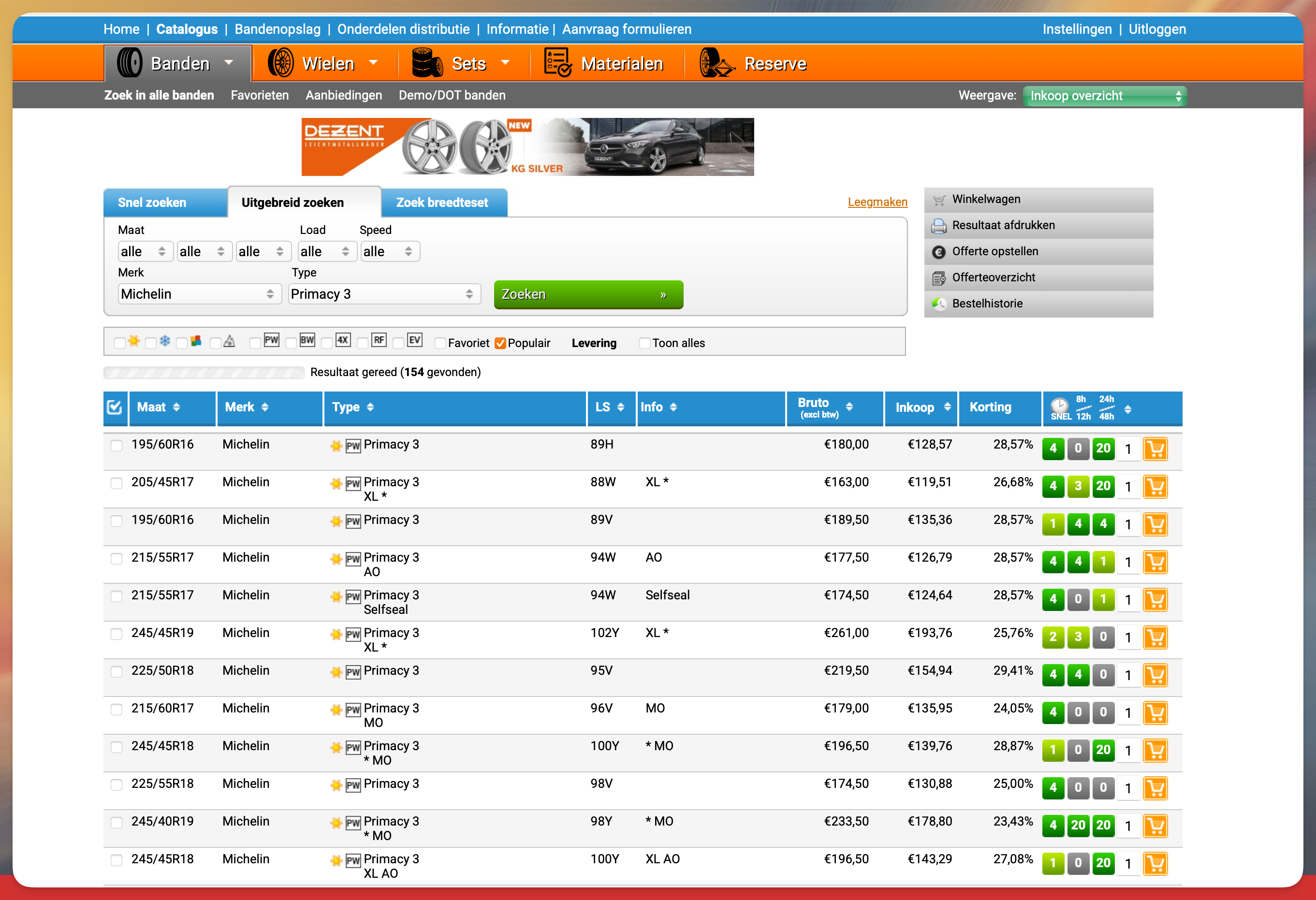 De Tyrenet grossier scherm, hier kun je de gewenste banden zoeken, en ook toevoegen aan het winkel mandje |