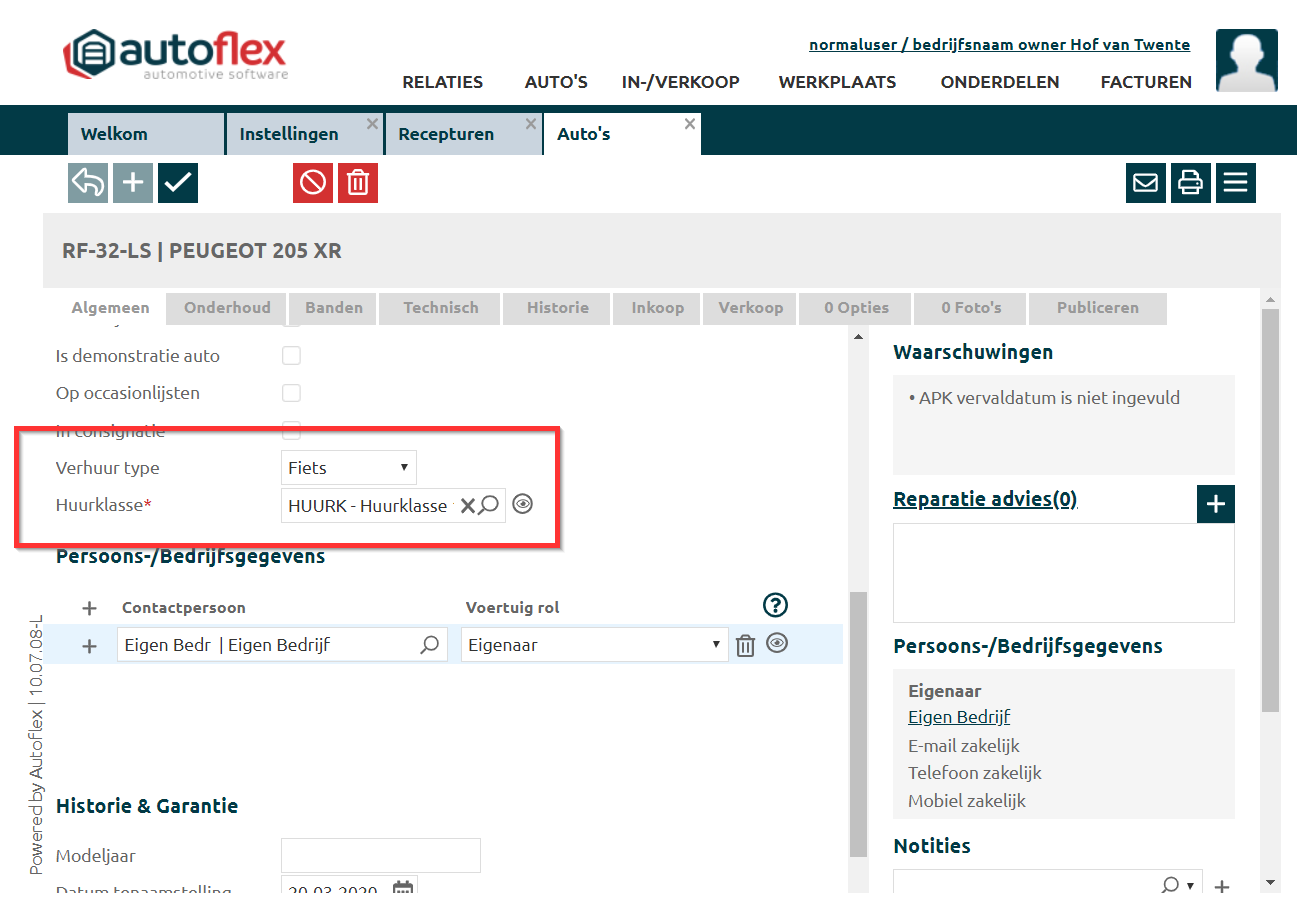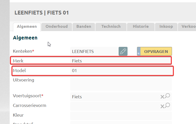 Het is belangrijk dat bij het huur/leenvoertuig het veld Merk en Model zijn ingevuld. Als het om een leenfiets gaat kan je bijvoorbeeld bij Merk Fiets invullen en bij Model 01 invullen |