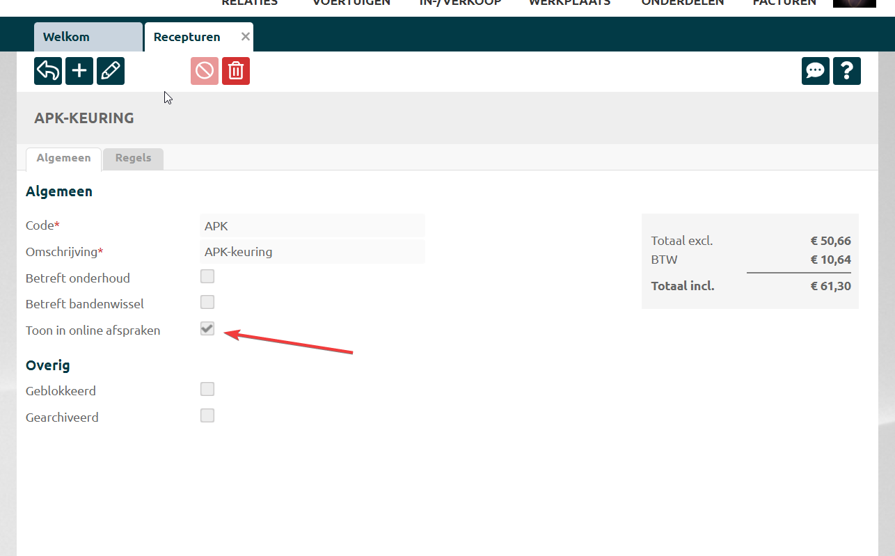 Zet bij in ieder geval één receptuur het vinkje Toon in online afspraken aan.