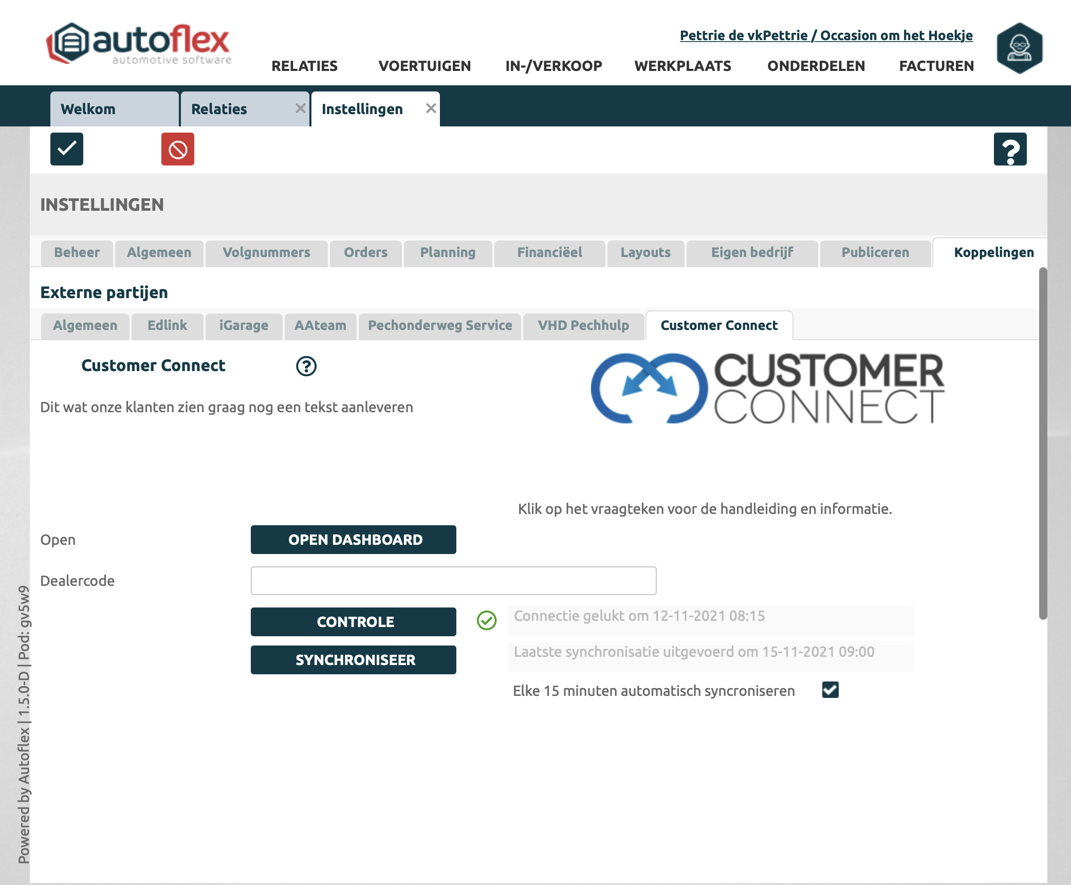 Instellingen → Koppelingen → Customer Connect |