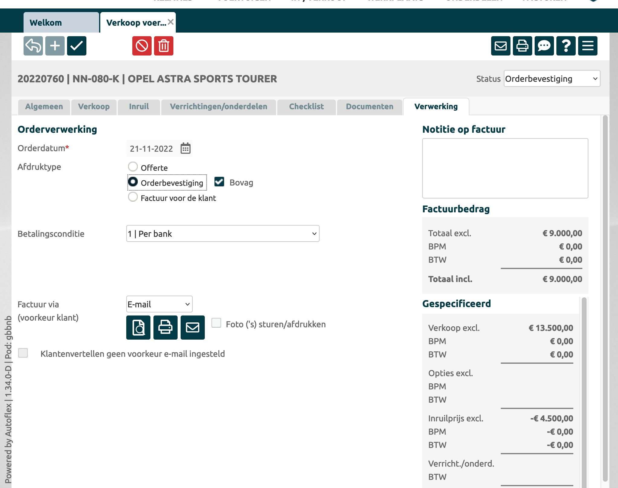 Bij het verwerken van de order, in de tab: Verwerking bij de keuze: Orderbevestiging is er nu een keuze: Bovag bij gekomen. Zodra deze optie is aangevinkt zal het Bovag: Koopovereenkomst-auto-particulier PDF document worden aangemaakt. Deze kan worden geprint via de print knop of direct naar de klant via e-mail worden verstuurd. De bovag koopovereenkomst is alleen zichtbaar bij verkoop naar particuliere kopers. |