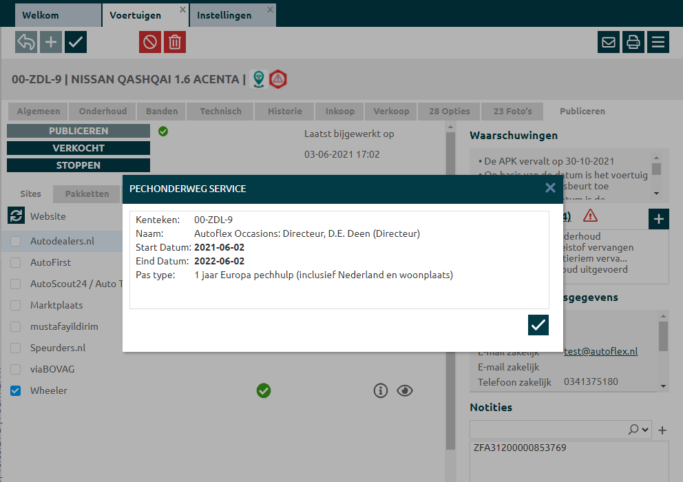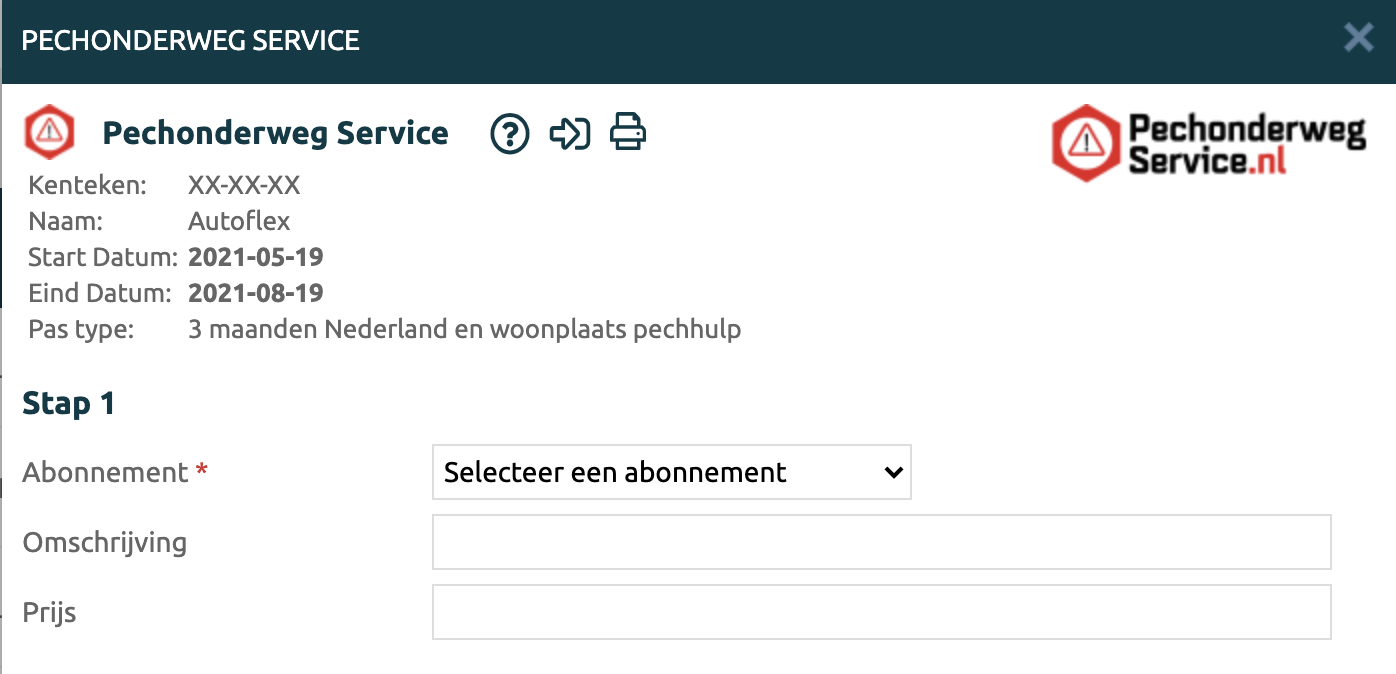 In het Pechonderweg Service dialoog is het actieve abonnement zichtbaar Bij de stamgegevens van het voertuig is nu een icoon zichtbaar, als je hier op klikt verschijnt een dialoog met de korte informatie over het afgesloten abonnement. |