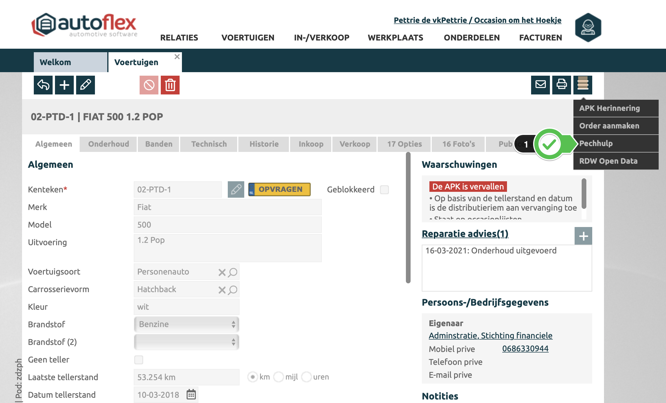 Deze koppeling geeft je de mogelijkheid direct vanuit Autoflex een pas aan te vragen, hierbij worden de gegevens van de relatie en het voertuig automatisch door gegeven naar Pechservice Onderweg. Daarnaast kun je snel de bestaande abonnementen bekijken direct vanuit Autoflex. PechOnderweg beid de mogelijkheid om kosteloos deel te nemen, je betaalt alleen voor registraties. De alarmcentrale van Pechonderwegservice.nl is 24/7 bereikbaar. Aanmelden kan via: https://www.pechonderwegservice.nl/lid-worden-autobedrijf/