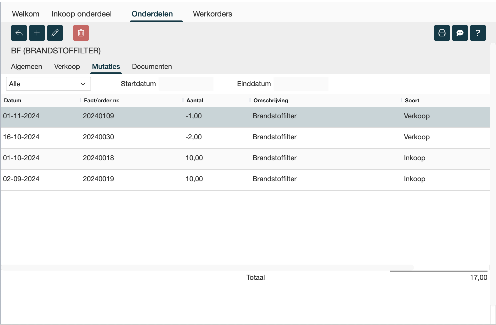Je vindt bij het tabblad mutaties de mutaties die zijn gedaan om de huidige voorraad van het onderdeel te bepalen.